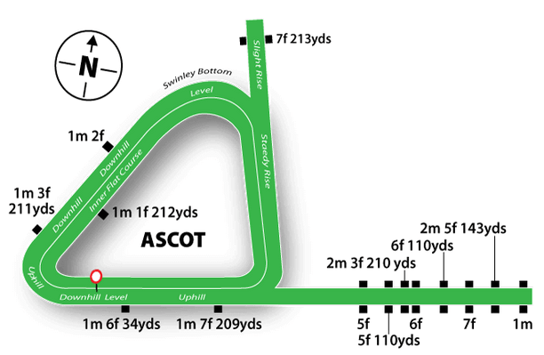The round course is a right-handed, triangular circuit of fourteen furlongs, with a run-in of 2½ furlongs. There is a straight mile course and the Old mile course which joins the round course in Swinley Bottom. Despite the downhill run into Swinley Bottom and relatively short run-in from the final turn, Ascot is galloping in character. Since the redevelopment, the turn into the straight has become more sweeping and those ridden prominently can be difficult to peg back. Nowadays, the ground in the straight drains quicker than the rest of the course, meaning going descriptions can vary.
