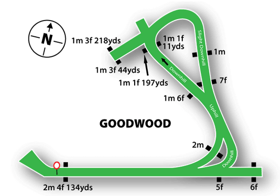 Right handed. There are two bends; all races up to a mile and a quarter use the lower bend, and in excess of eleven furlongs use the top bend. Although there is a five-furlong run-in from the top bend, the turns and the pronounced downhill gradients make Goodwood essentially a sharp track, favouring handy types, particularly in the shorter-distance races. The five-furlong course is one of the fastest in the country, meaning speedy sorts often have an advantage. A notoriously tricky course, those held up regularly meeting trouble in the straight, particularly when kept to the rail.