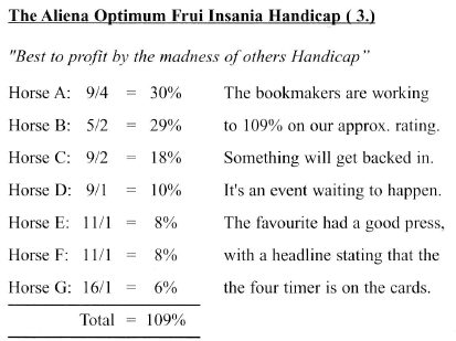 The race you actually came for is the last race or the day - "The Get Out Stakes." You're convinced that the favourite is no good, notwithstanding, that he has won his last three races. The horse carries top weight today in a seven runner handicap and the five pound claimer who rode him, in large field handicaps, in his past three wins, has the ride today.