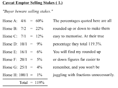 Just at the off you can see that you could have done better as there was some 8/ I available on horse C. but don't worry some Of the most astute professionals back this way and they rarely get the best price all round; despite their determination. Had you backed the favourite in this race at the 4/6 offered, you would have stood to win €80. The race begins in earnest and the favourite, a confirmed front runner, does what front runners do. You're having second thoughts. Glancing around, you see that the punters all look very confident and, you can gain no comfort from the poker faces of the bookmakers who have laid the favourite.